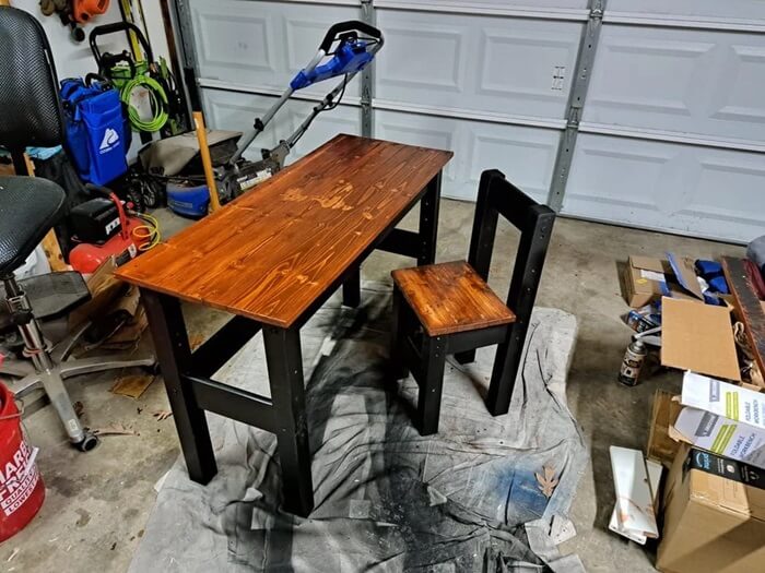 The tabletop and chair seat are made from brown pallet wood, while the bed appears to have formed the black base of both pieces of furniture.