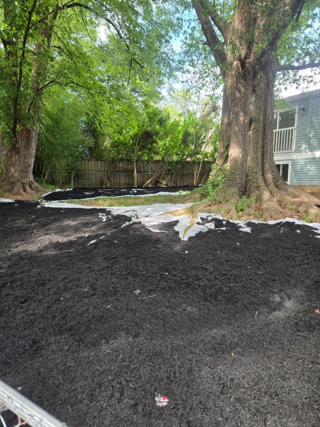 In the post, they shared a picture of a plastic tarp covering a yard with a layer of mulch on top. They captioned the photo: "This can't be normal."