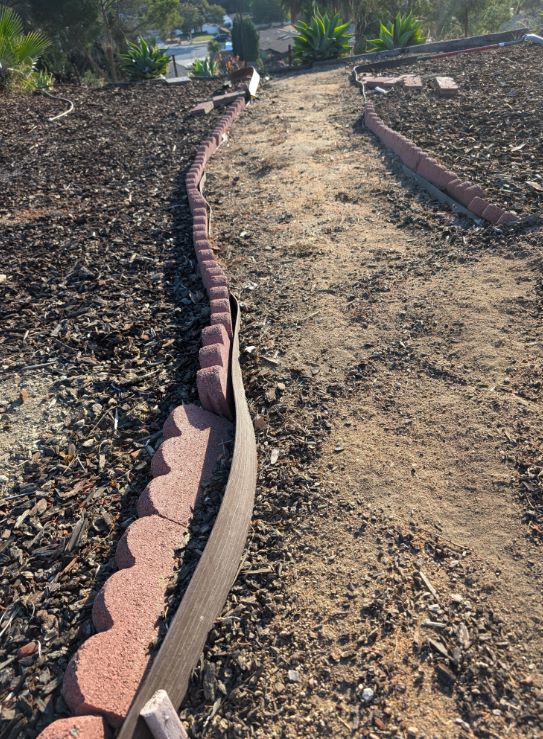 The OP's picture shows a partially deconstructed walkway lined with scalloped brick edging stone and plastic landscape edging. The path between the edging stone, where the decomposed granite walkway will sit, is barren with some wood chips.