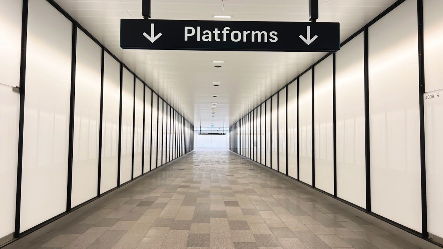 The photo shows a public transportation terminal drenched in ads, from the floor to the ceiling.