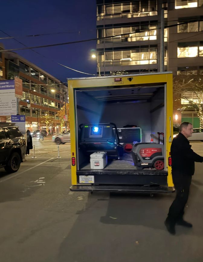 "Spotted this box truck at Westlake and Thomas running a gas generator to power a projector just showing a huge AT&T ad on the side of a building. Really hope this doesn't become a standard thing. It's so wasteful and covering our buildings just makes our city uglier," the post reads.
