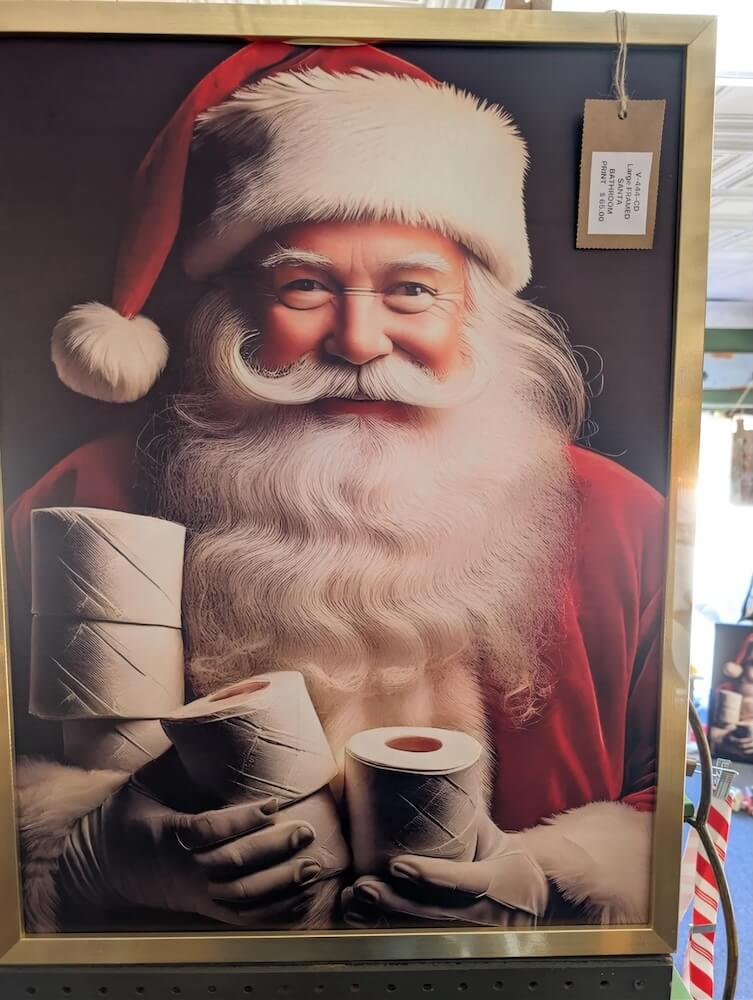 The user posted a photo to the r/ThriftGrift subreddit of a framed picture of Santa Claus holding several rolls of toilet paper. The post is titled simply: "AI artwork for $65."