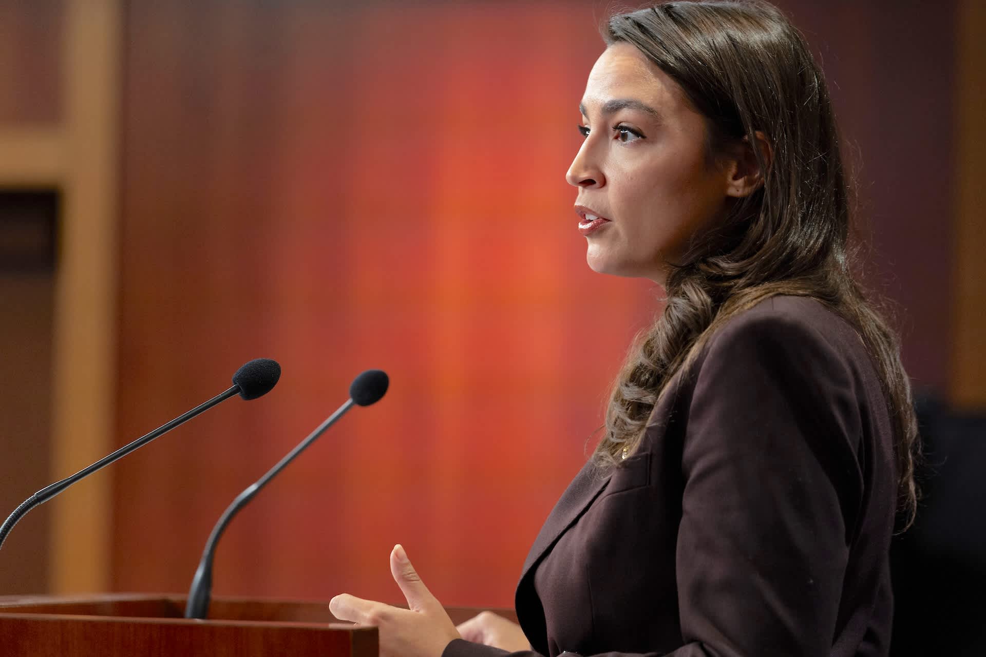 Rep. Alexandria Ocasio-Cortez, in a brown blazer, speaks at a podium with microphones against a blurred background.