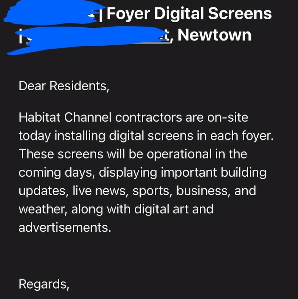 "We're constantly being advertised to throughout the day, and now I can add while waiting for the lift in my own apartment building to that list." The OP also noted a rent decrease is unlikely despite what the corporate property may get for this commercial partnership.