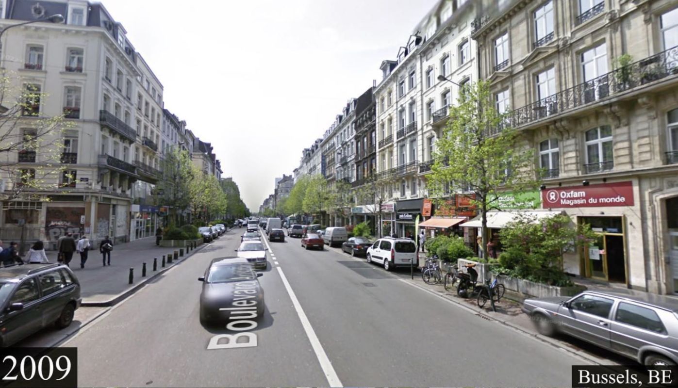 The Boulevard Anspach is a central, well-known street in Belgium's capital. Cars Destroyed Our Cities' photos from 2009 show a busy four-lane road with packed parking along the sides. A few trees and planters made it pleasant for a city street, but it was still clearly designed with drivers in mind, not pedestrians or cyclists.