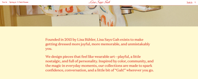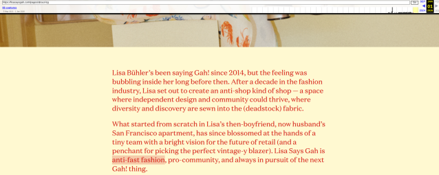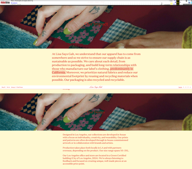 While no conclusion can be drawn that changes were directly in response to French's video, as of reporting, Lisa Says Gah's website no longer has claims about sustainable supply chains, does not state that it manufactures predominantly in California, does not mention prioritizing natural fibers and using recycling and reusable materials whenever possible, and no longer mentions "deadstock" or the phrase "anti-fast fashion."