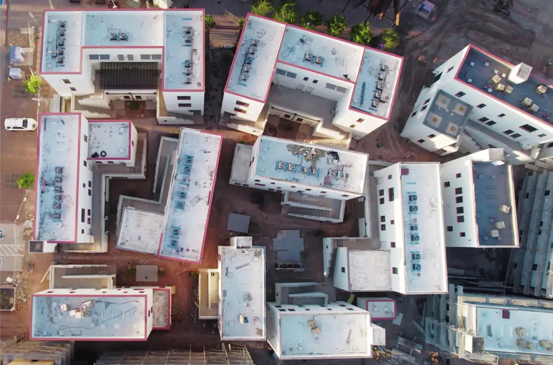 Walking the streets of the $170 million, 17-acre community, which is in reality more like a large campus within the city of Tempe, residents notice no parking for cars among the Mediterranean-style white units. Instead, the homes are mixed with courtyards for social gatherings, grocery stores, restaurants, and yoga studios. For residents of Culdesac, they have everything they need for their economical, physical, and social well-being within walking distance.