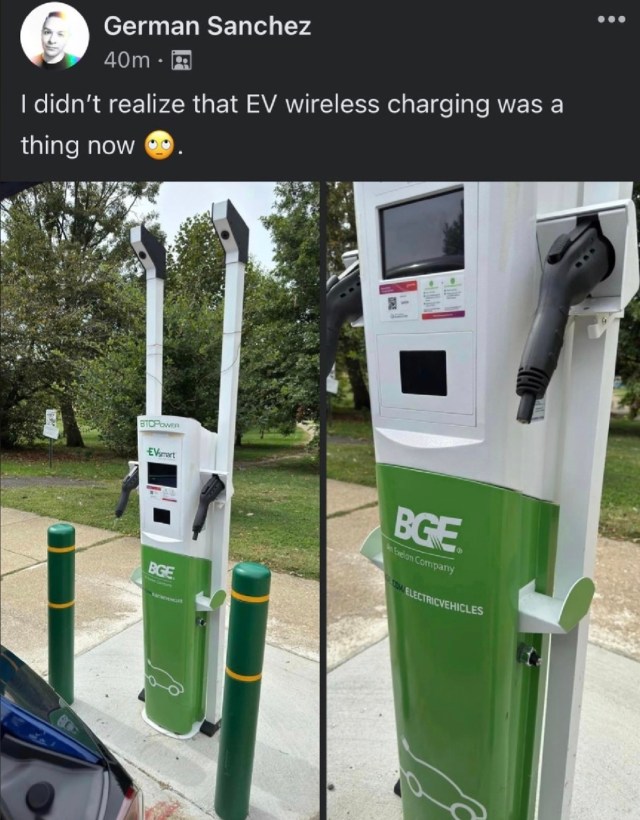 The image, reposted from X, shows an EV charging station missing its cords, with one commenter quipping, "I didn't realize that EV wireless charging was a thing now."