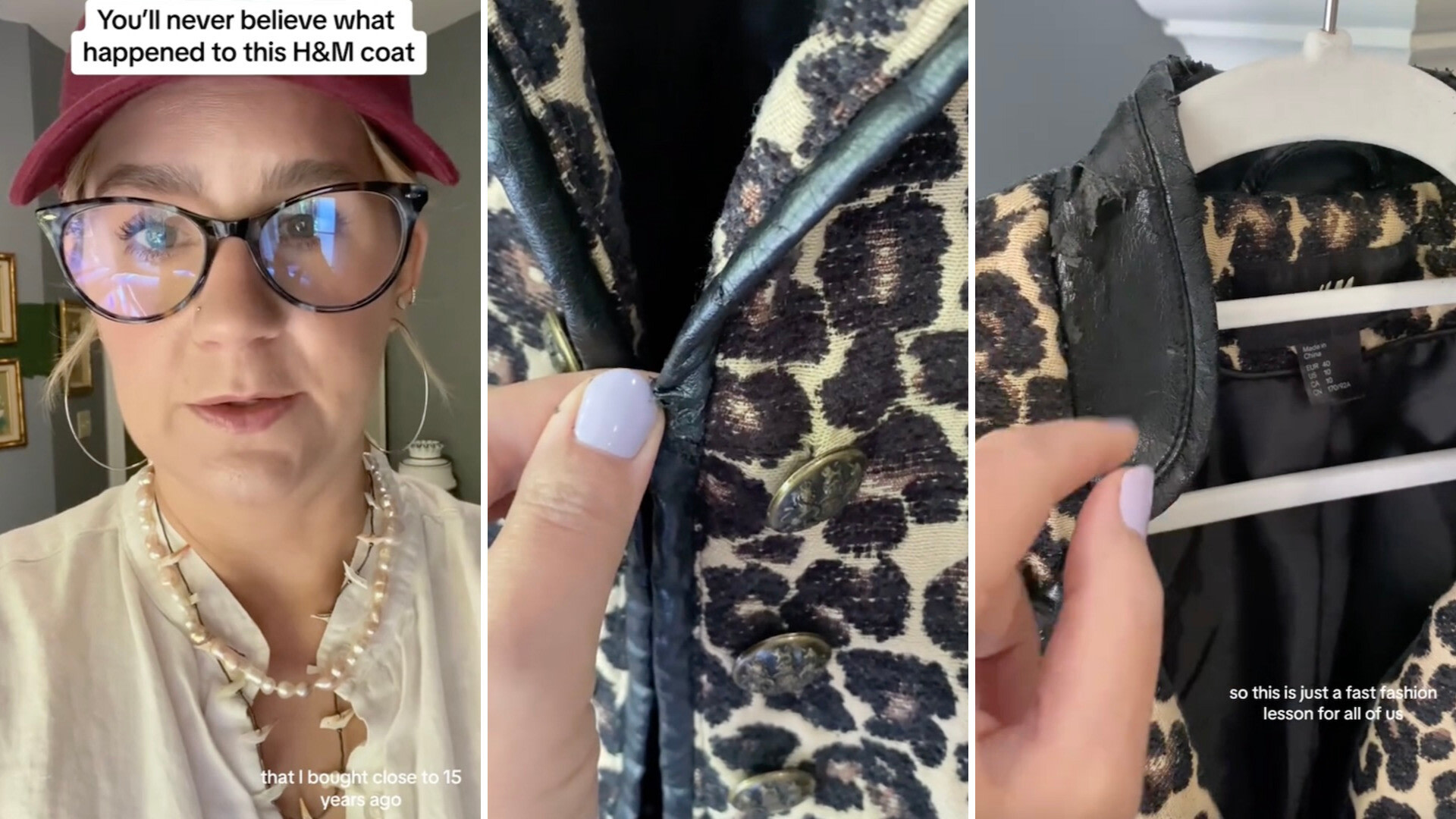 The creator explains how disappointing it is that even if fast-fashion pieces don't fall apart over the years, the materials are cheap and do not keep.