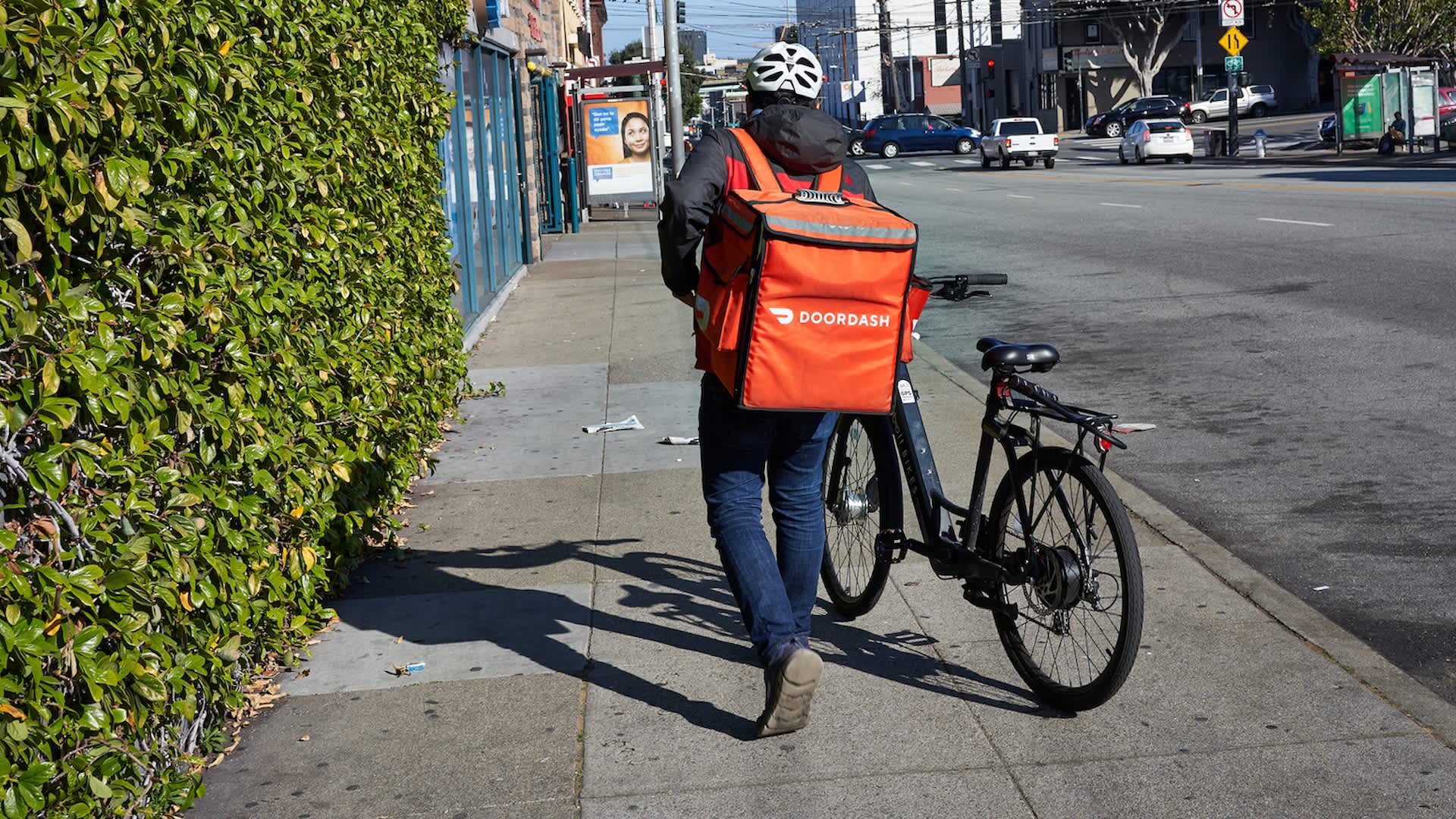 A person in a black jacket walks with a bicycle and an orange DoorDash delivery bag along a city sidewalk.