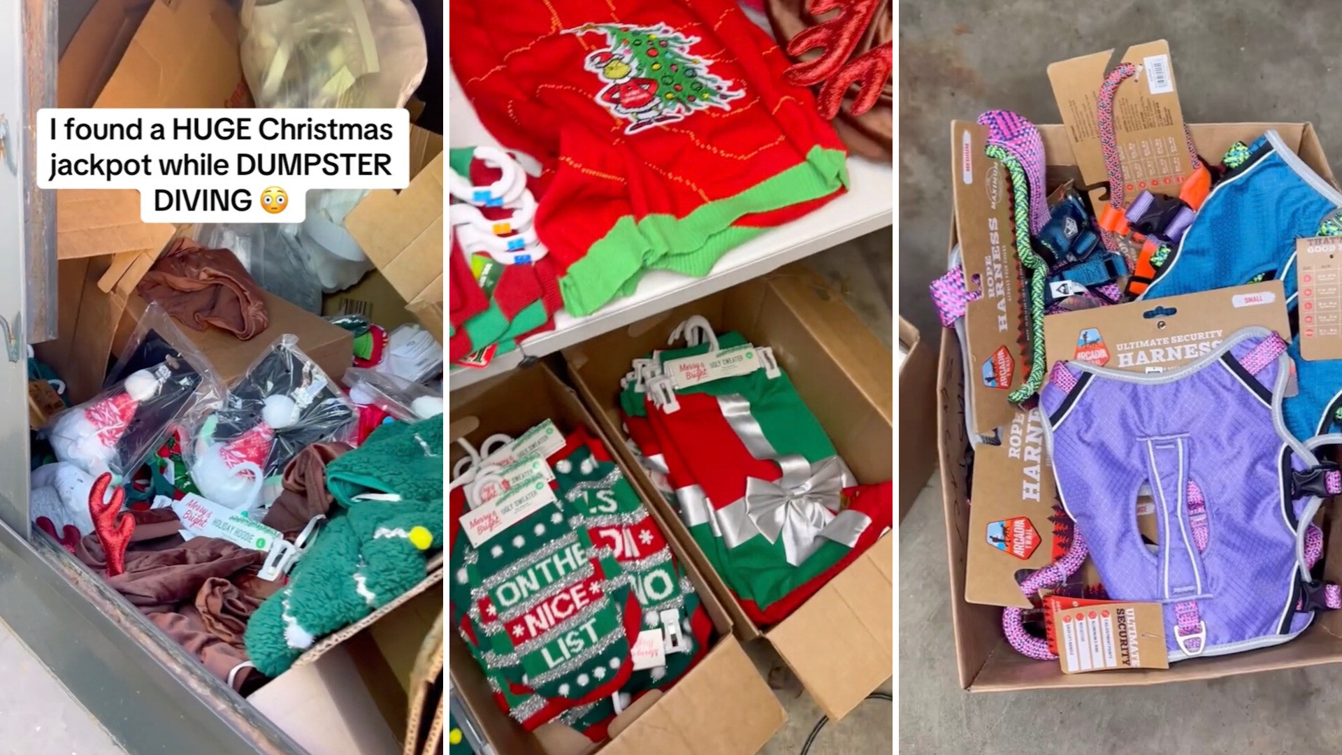 An avid dumpster diver on TikTok showcased the perfectly good Christmas-themed pet supplies they found thrown into dumpsters at PetSmart. All the items still included tags and most were still wrapped in their sealed packaging.