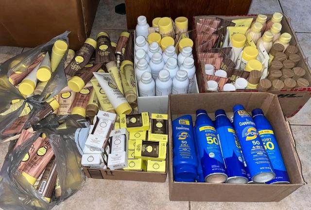 The photos show multiple boxes of unopened sunscreen — some Coppertone, but mostly from the Sun Bum brand.