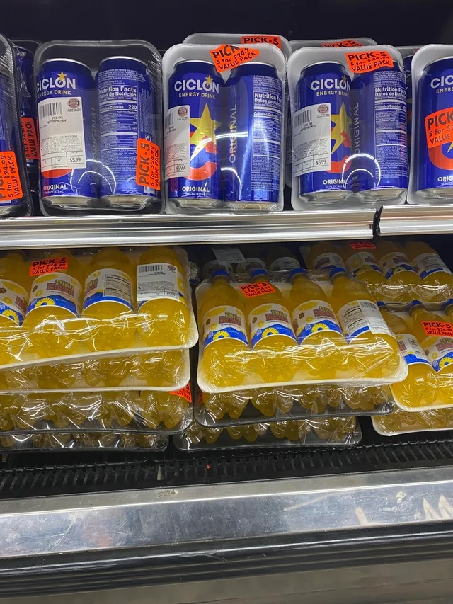 The drinks are laid flat with plastic wrapped all the way around them — packaged the same way meat would be.