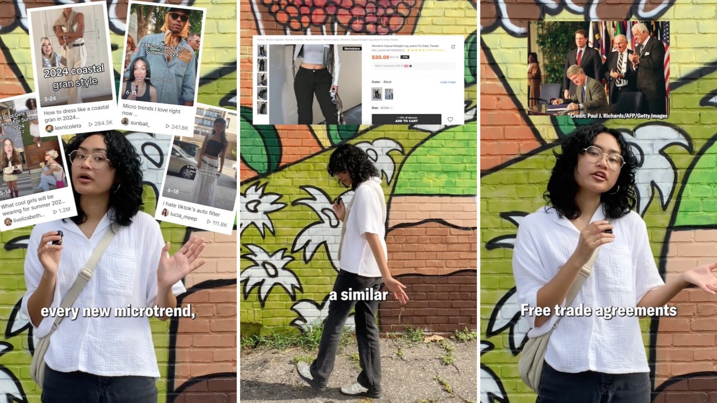 "Why don't my jeans fit properly anymore?" a TikToker asks. "... If I were to buy a similar pair of pants today, they likely wouldn't feel as nice as these do," they continue while showing off their jeans from the 90s. "They wouldn't be 100% cotton. There'd be frayed edges and loose threads, and the zipper would easily break."