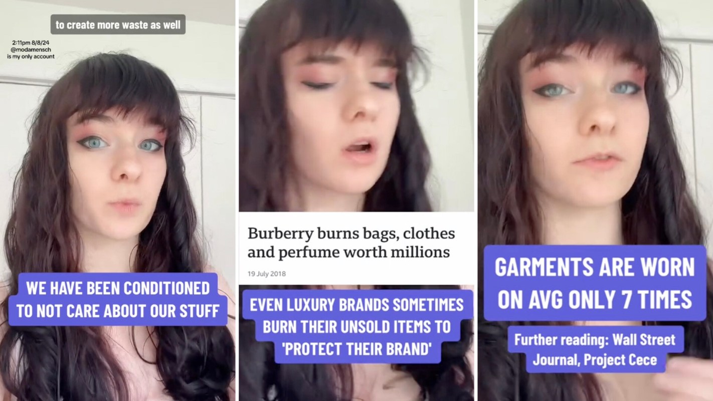 "The most important thing people need to understand about the fast fashion industry is the sheer amount of waste it produces," says sustainable fashion educator Jade (@modamensch) in a TikTok video.