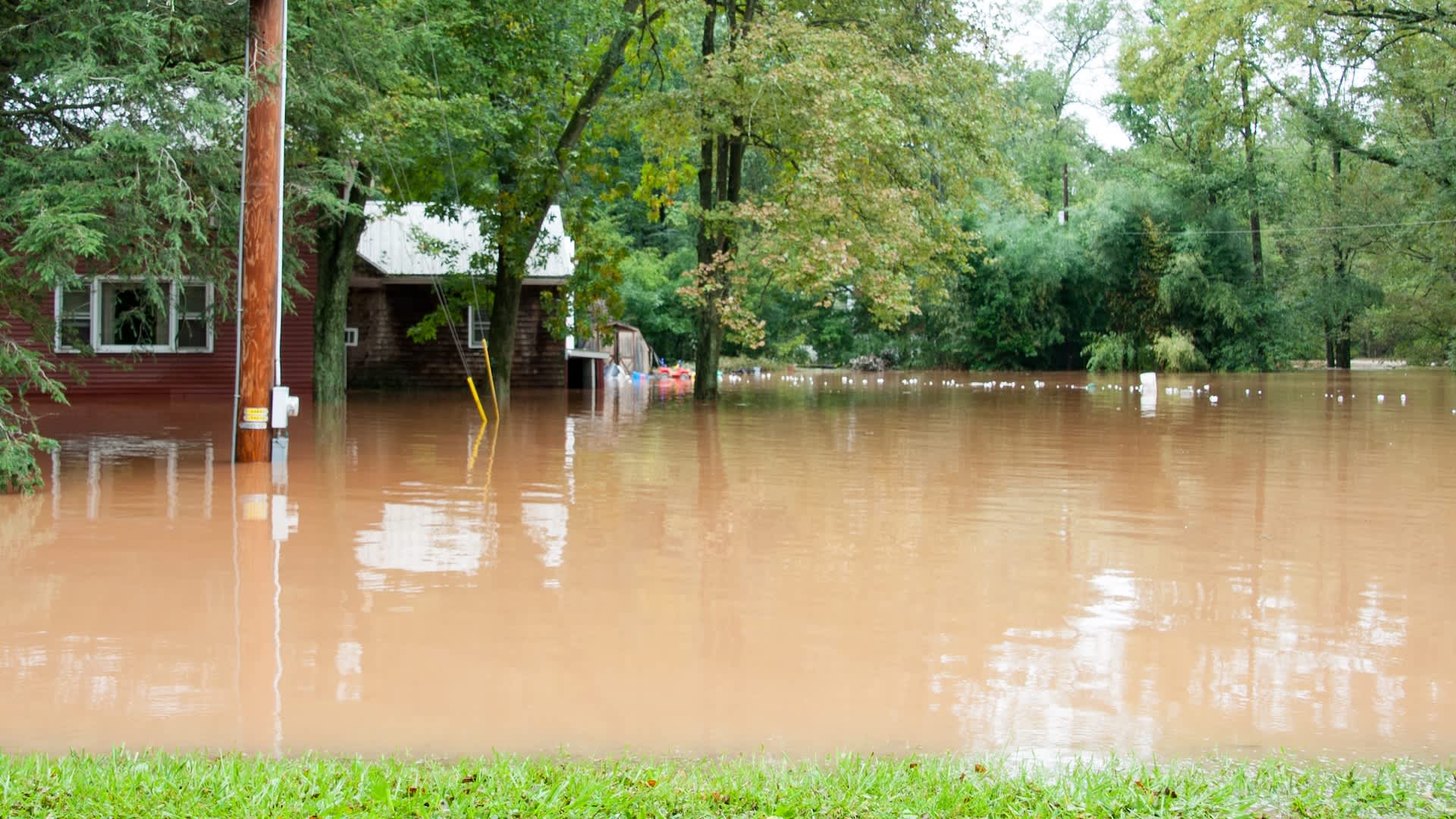 A house partially submerged in muddy floodwaters, surrounded by trees and debris.