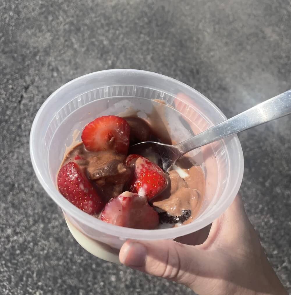 The photo reveals a hand holding a container filled with yummy goodness and strawberries, but context is everything.