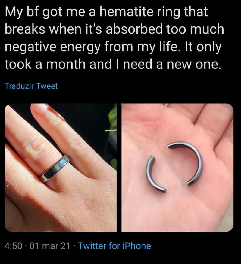 The X post revealed a broken ring and says: "My bf got me a hematite ring that breaks when it's absorbed too much negative energy from my life. It only took a month and I need a new one."
