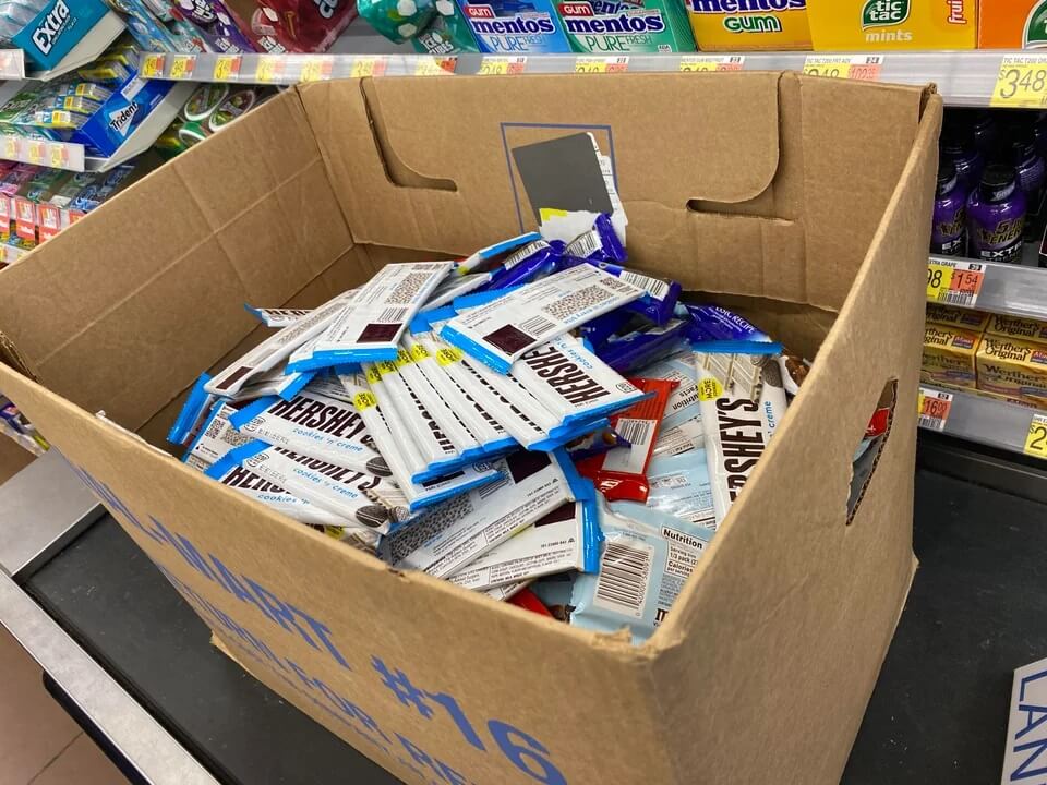 An apparent Walmart employee posted a picture of a cardboard box full of chocolate bars with a caption saying, "All of our expired candy from 1 register."