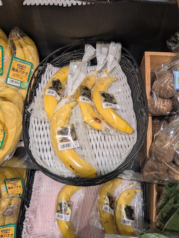 Their first photo shows a basket at a store full of individual bananas. Each one is packaged in a printed plastic bag with a twist tie and a sticker label.