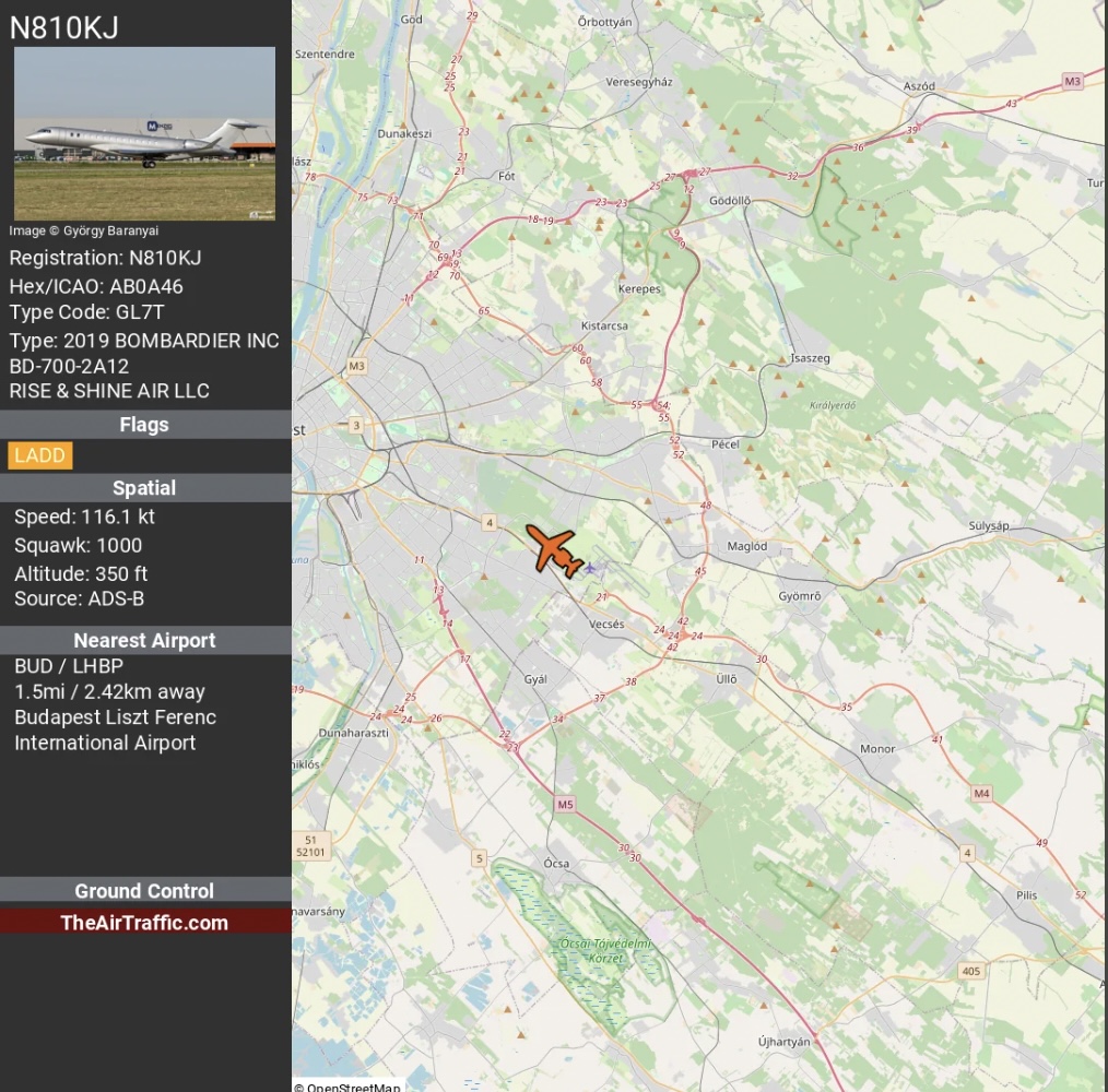 The tracking image shows jet N810KJ departing from the Hungarian capital. The aircraft appeared to spend minimal time on the ground before it took off again.