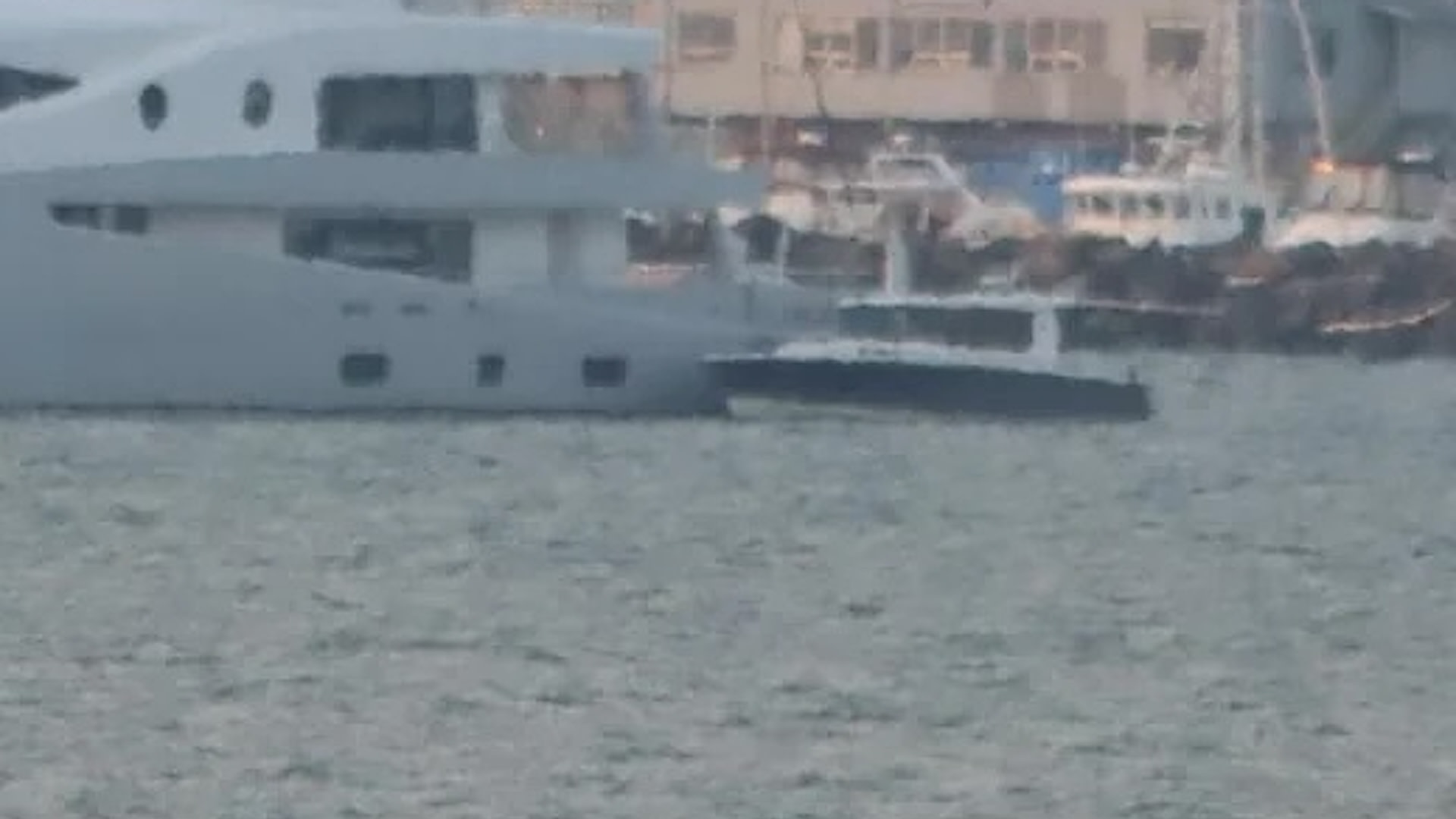 The photo shows a massive yacht near a small bay, with smaller boats in the background that the large ship appears to tower over in size.