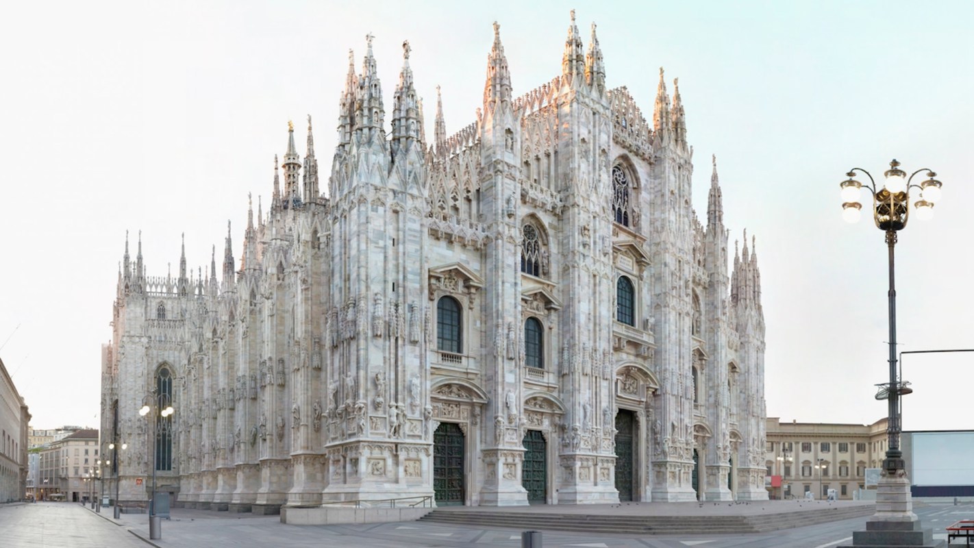 The ultra-modern MaxMara advertisement, apparently for eyewear, contrasts awkwardly with the Gothic beauty of the cathedral, which a commenter identified as the back of the Duomo in Milan. Construction on the cathedral began in the late 1300s.
