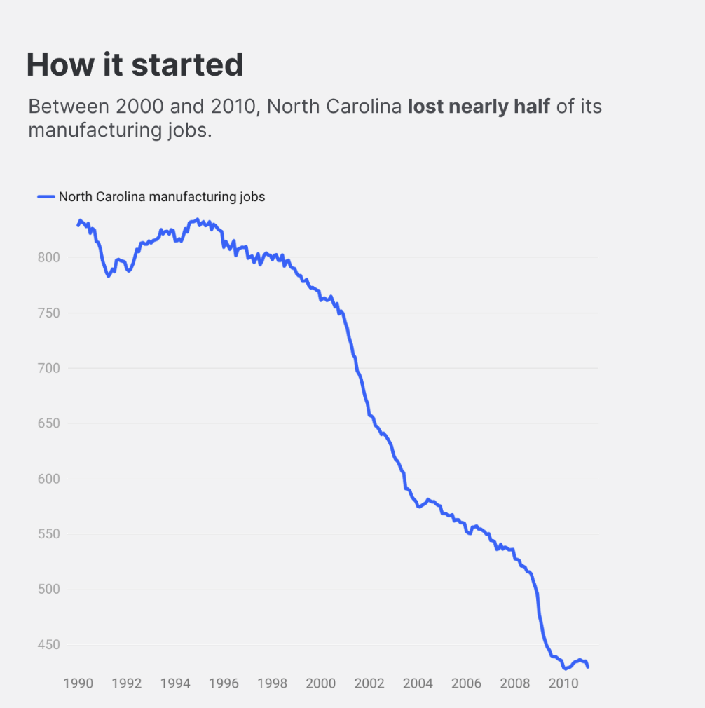 After China joined the World Trade Organization in 2001, factory jobs in North Carolina collapsed — especially in textiles, apparel, and furniture. Entire communities in places like Hickory and Alamance County saw their local economies hollowed out.