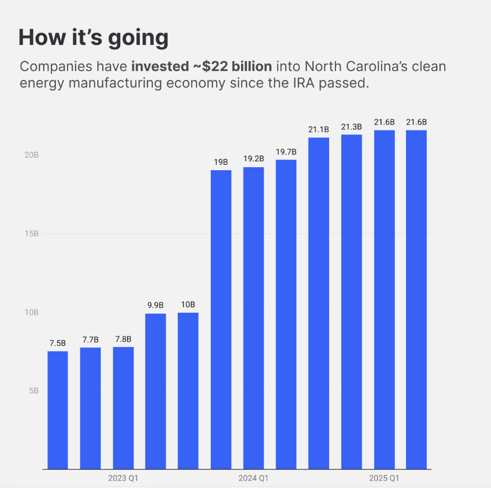 North Carolina has emerged as one of the biggest winners of this law. Companies have flocked to the state, investing more than $20 billion in new advanced manufacturing facilities.