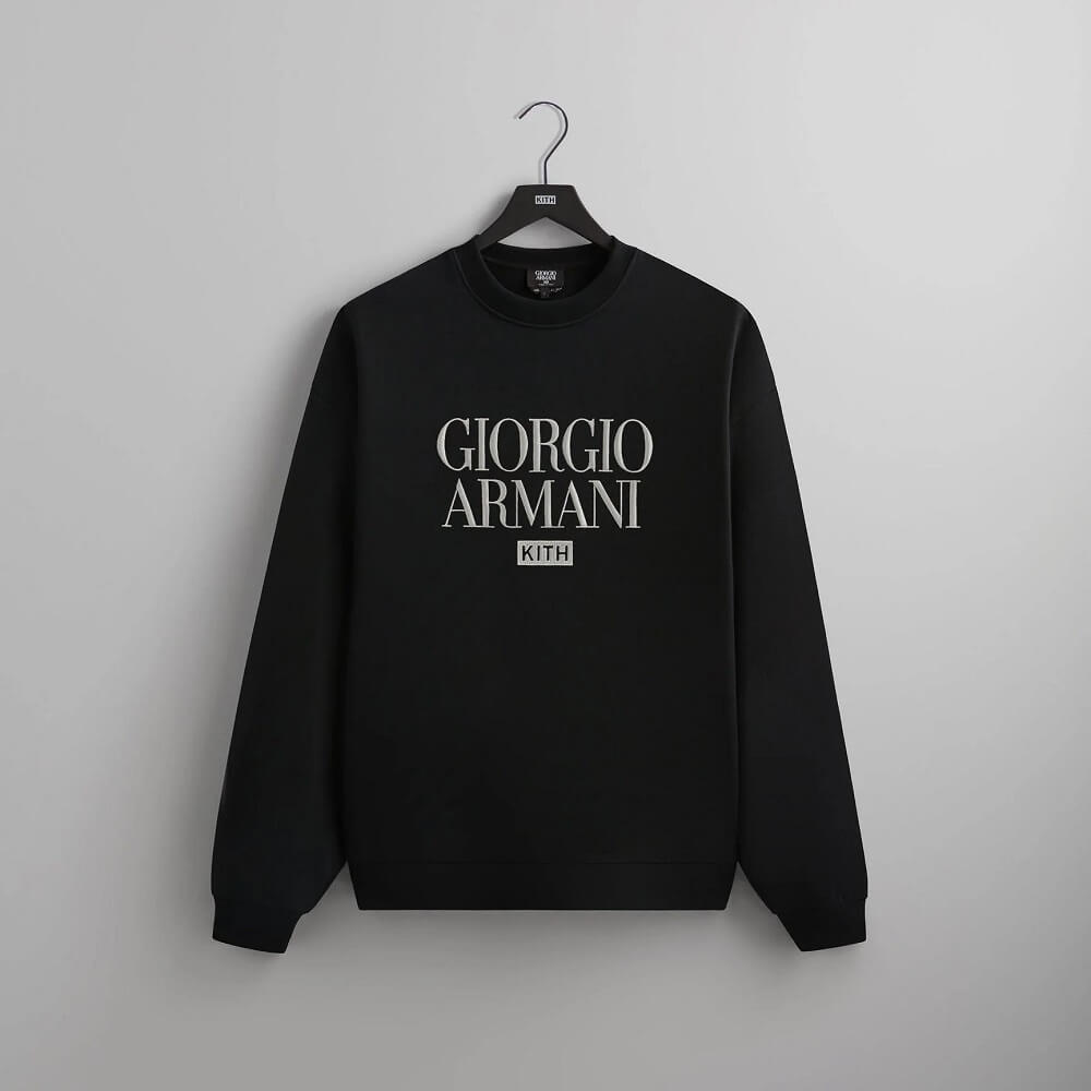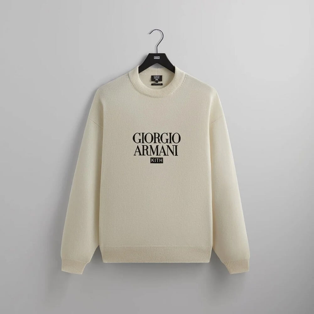 The photos show a plain sweater, crew-neck sweatshirt, and T-shirt with Giorgio Armani Kith's simple logo. According to the OP, who posted the prices in Euros, the sweater costs approximately $2,563, the sweatshirt $779, and the tee $461.