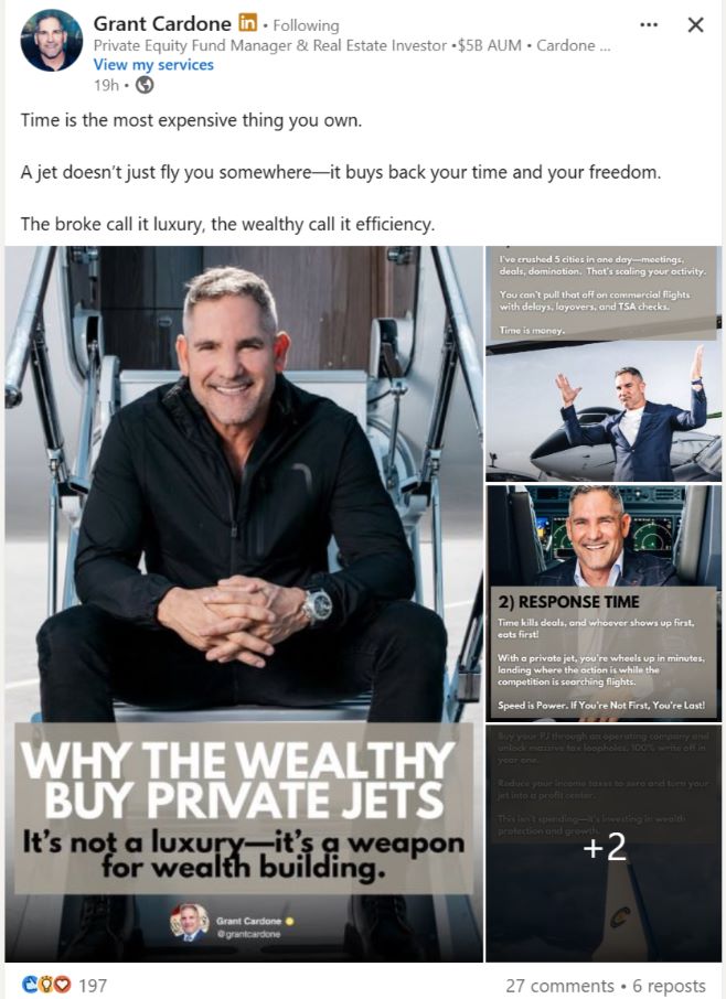 A post from entrepreneur and investor Grant Cardone recently went viral on Reddit after he shared a message implying that owning a private jet is a sign of "efficiency," not extravagance. "Time is the most expensive," Cardone wrote, adding, "The broke call it luxury, the wealthy call it efficiency."