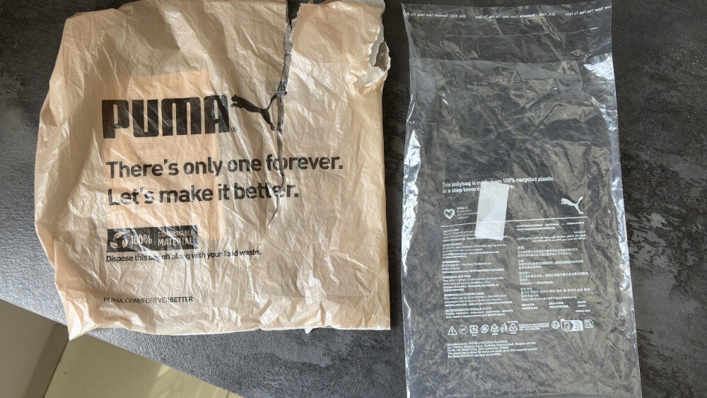Puma's packaging choices are raising eyebrows online after a Redditor found what appears to be an eco-friendly paper bag containing a standard plastic bag inside.