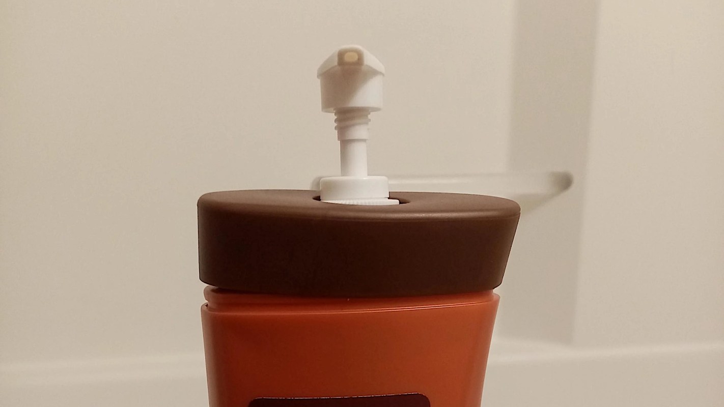 In the first image, the dark-brown plastic trim at the top of the bottle is askew, indicating that there is less lotion in the bottle than initially meets the eye. The second photo, in which the original poster has removed the trim, confirms those suspicions.