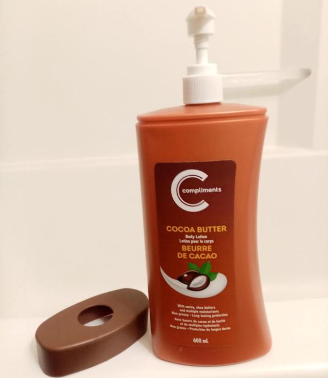 Compliments' cocoa butter packaging prominently displays the volume of lotion in each bottle. Nonetheless, the thick trim at the top, which contains none of the product, may still visually trick people into thinking they are getting more lotion than they actually are, leading to a frustrating purchasing experience.