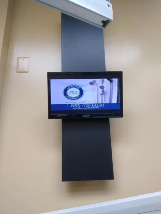 A frustrated patient shared an image of their dentist's relentless ad screen. A picture of the screen reveals an advertisement for a new shower head set.