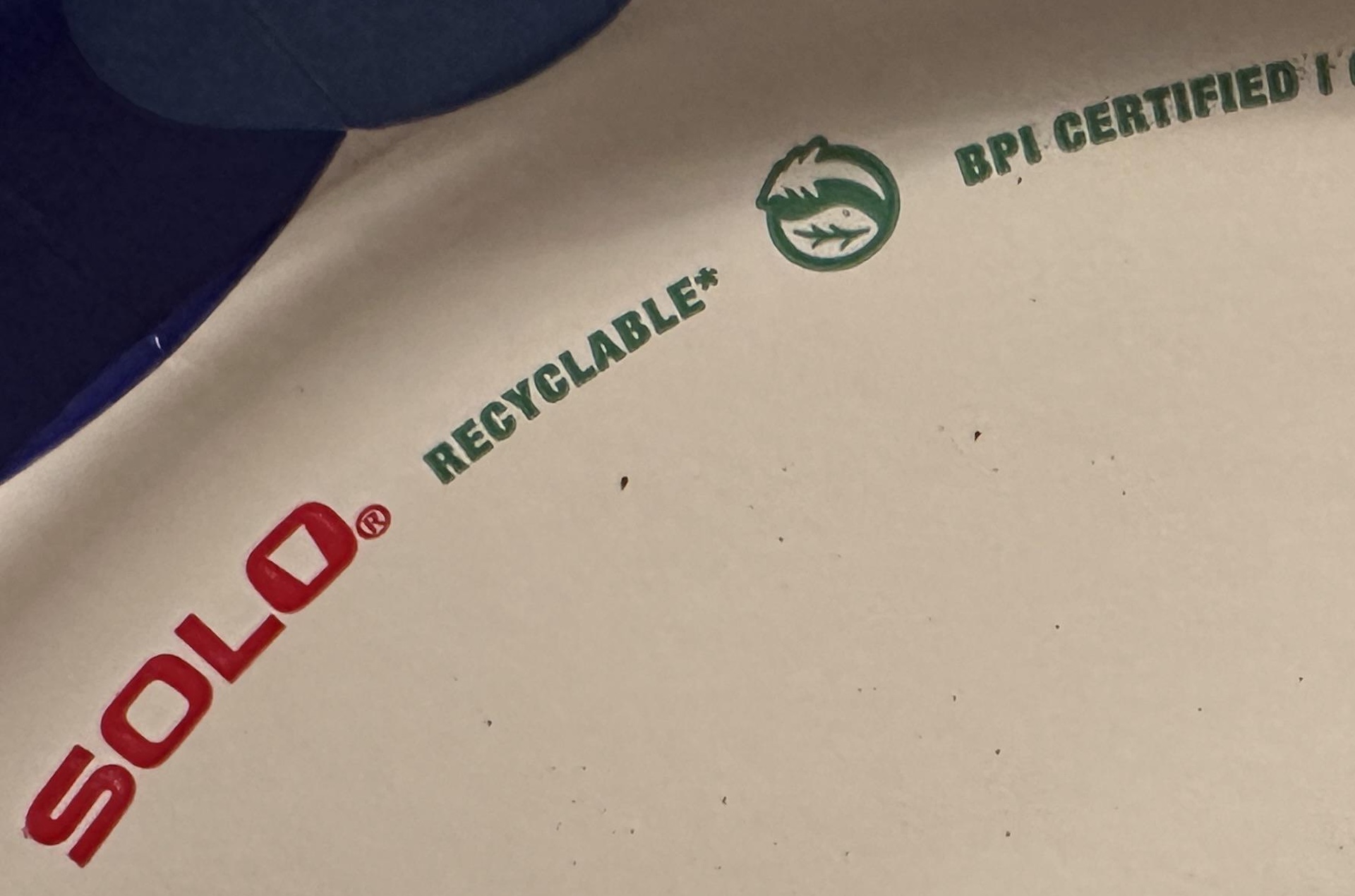 A post in the r/mildlyinteresting subreddit highlighted this disconnect between packaging claims and reality. A package of Solo plates reads "recyclable*" and/or "commercially compostable only*," with an additional disclaimer: "*facilities may not exist."
