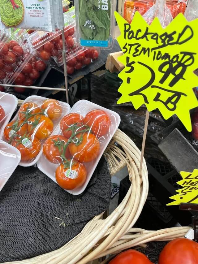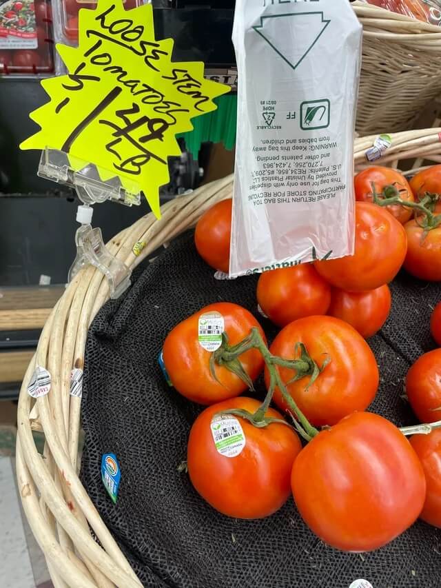 To illustrate the problem, they shared two photos: one of tomatoes on the stem being sold loose, and one of the same product being sold on a styrofoam tray wrapped in cellophane. The loose tomatoes cost $1.49 a pound, and the packaged tomatoes cost $2.99 a pound.