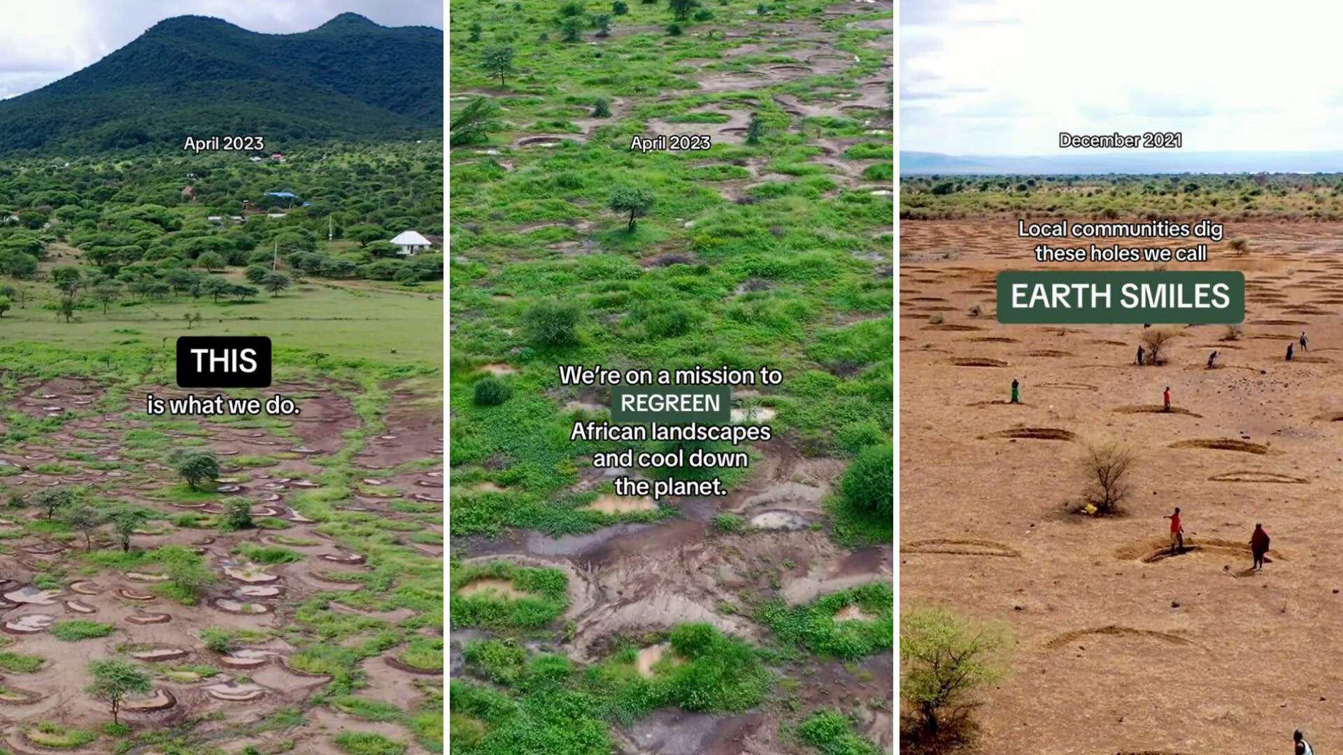 It shares photos of the organization's progress in Tanzania, where in just a year and a half, the area the organization worked on went from bare dirt to being half-covered in greenery that has spread enough to hide the original shapes of the holes.