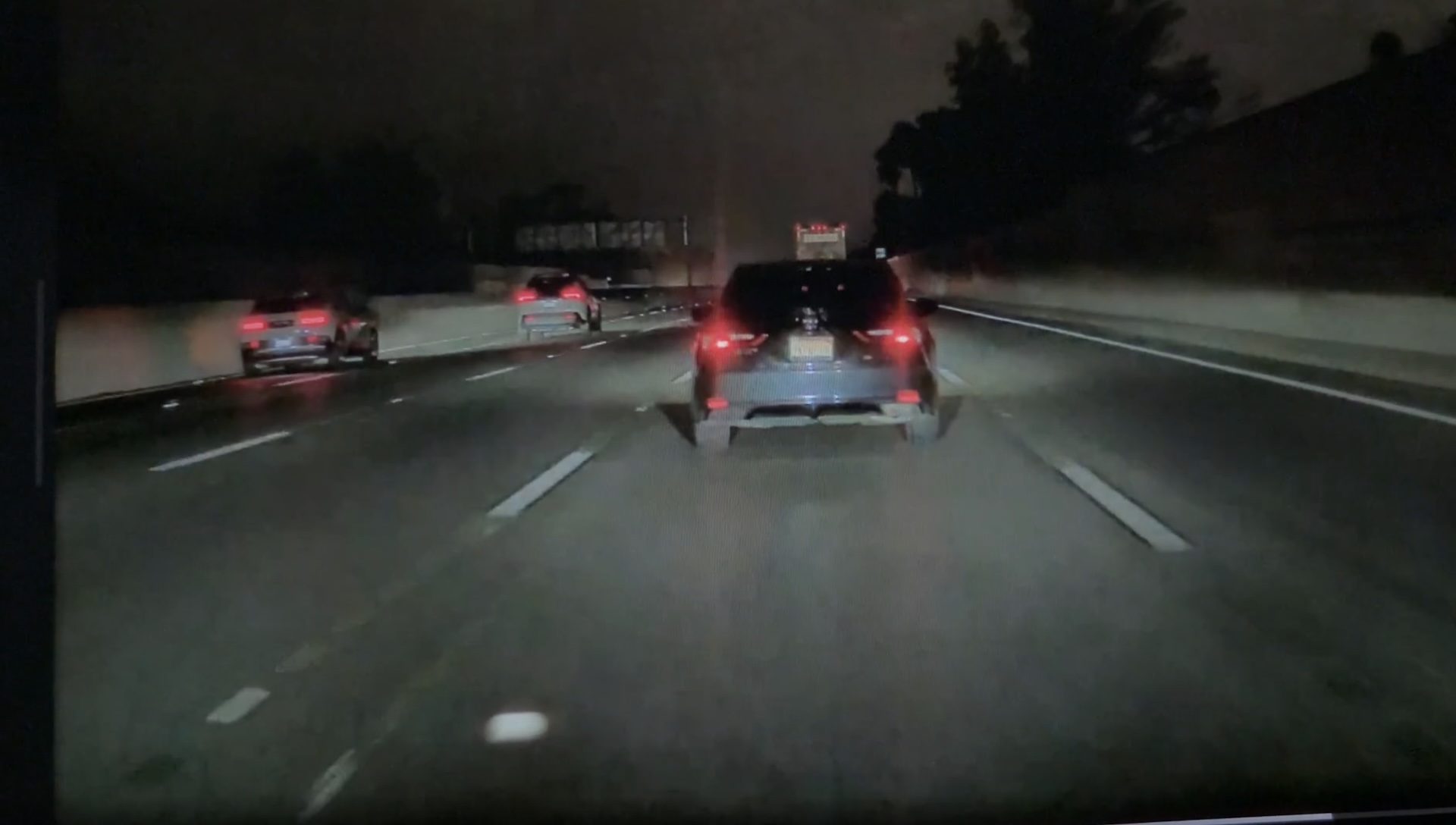 In the video, a Toyota Camry merges in front of the silent Tesla on U.S. Route 101 in Los Angeles and brake-checks the Tesla driver, even rolling down the passenger window to shout. The poster said they honked after the Camry swerved onto the highway without looking and that a few minutes later the driver sped up to tailgate.