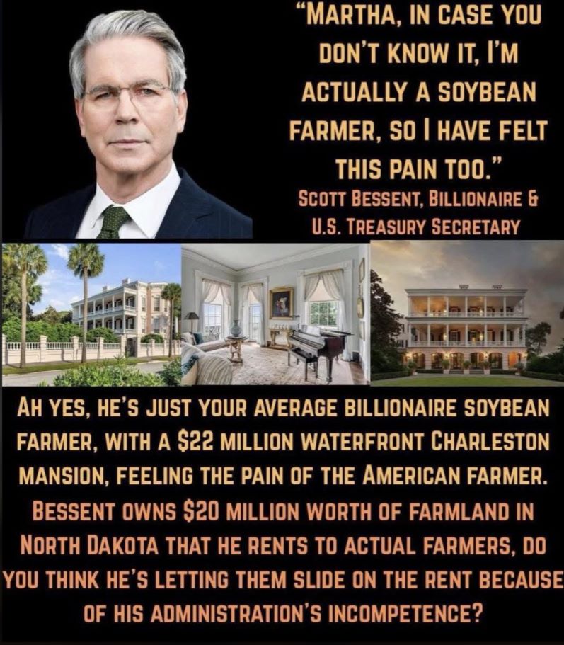 The post features images of Bessent alongside a sprawling waterfront Charleston mansion and states that the property is worth $22 million. It also states that Bessent owns $20 million in North Dakota farmland that he rents out to working farmers.