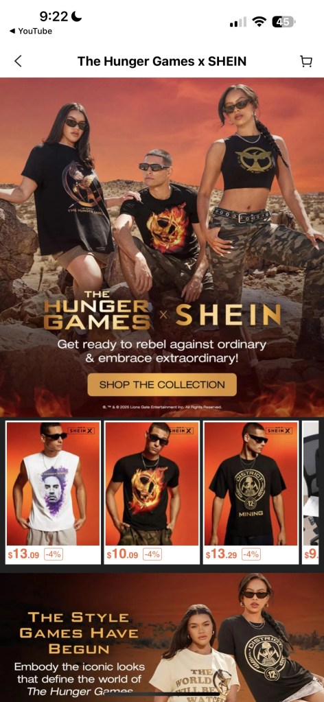 Shein, known for producing inexpensive, trendy clothing at high environmental costs, partnered with "The Hunger Games" franchise for a clothing line.