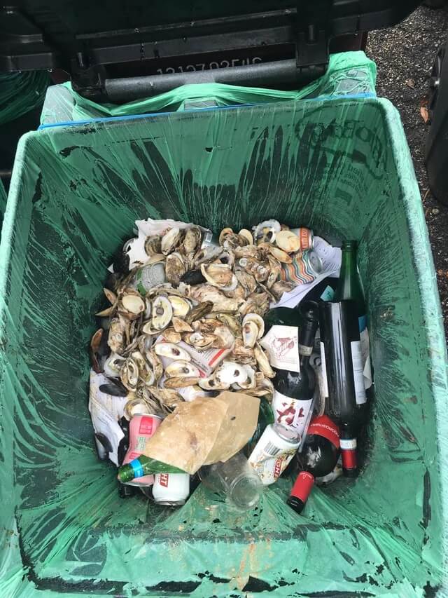 The accompanying photo shows a garbage can full of empty oyster and mussel shells, wine bottles, aluminum cans, and paper receipts.