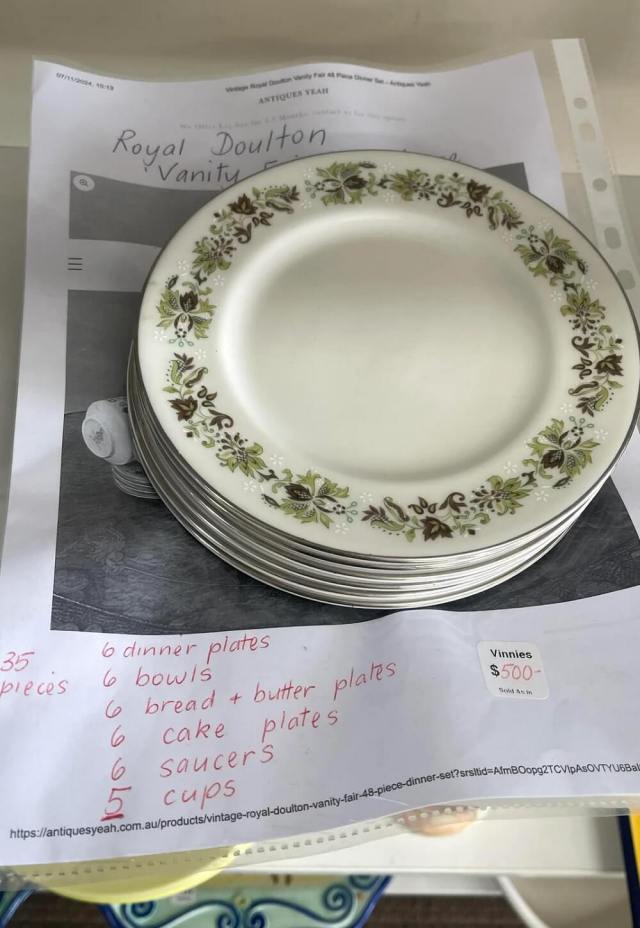 The attached image shows a charity thrift store pricing a single dish using what appears to be a high-end eBay listing as justification, despite the listing being for a full set and not matching the piece exactly.