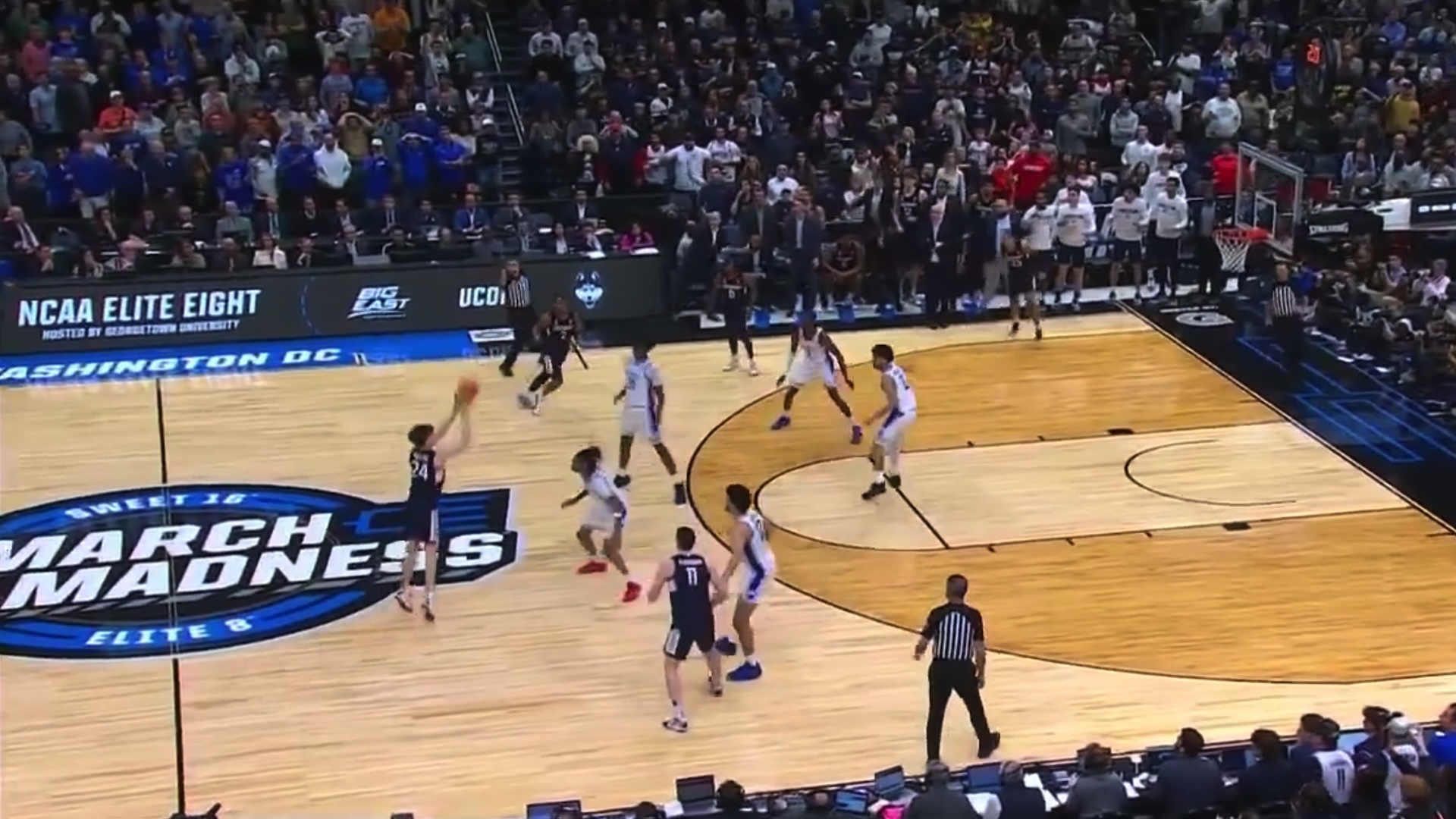 UConn's Braylon Mullins single-handedly put the madness in March Madness, hitting a 35-foot buzzer-beater to secure a 73-72 comeback victory over Duke in the Elite Eight.
