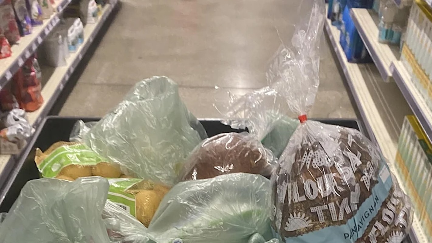 The worker posted a photo showing a shopping cart overflowing with bagged produce destined for disposal. They noted this represented just "an eighth" of what their store threw into waste bins in a single day.