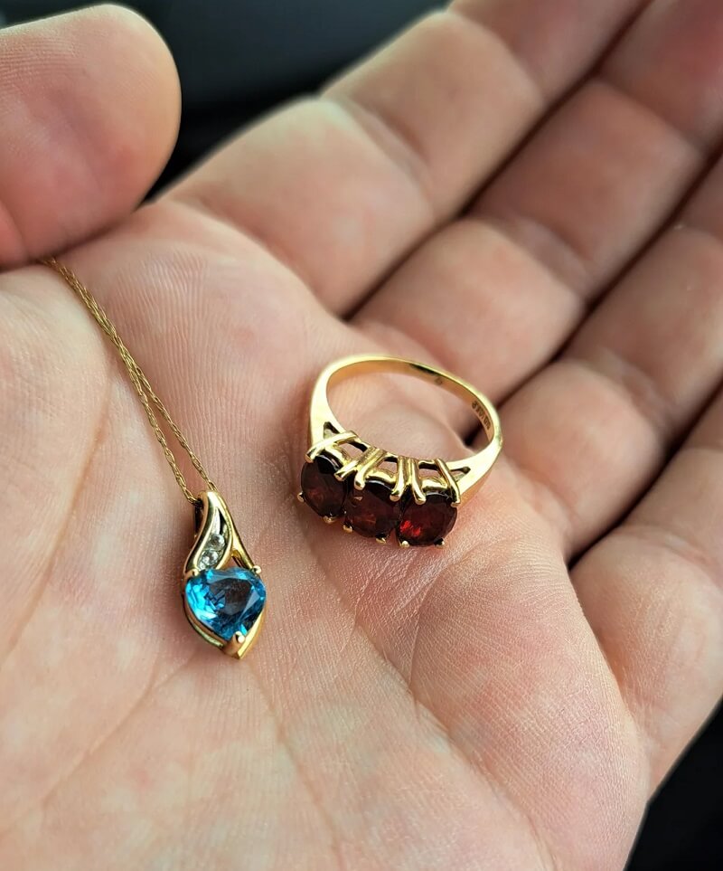 "Picked up some 10k gold jewelry at an antique shop for $25," the poster wrote above a photo of a necklace with a blue gemstone and a ring with three ruby-colored gemstones shared to r/ThriftStoreHauls.