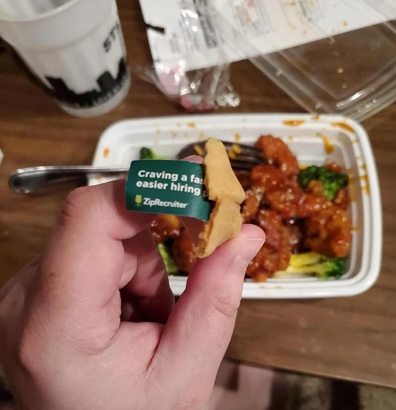 In this Reddit post on the r/a******design subreddit, a user shared a photo of their fortune cookie fortune. Only, instead of predicting the future or providing an insightful proverb, the "fortune" was an advertisement for ZipRecruiter.