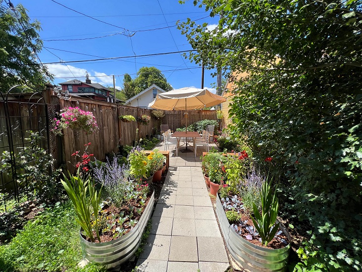 Fast-forward to July, and the space was unrecognizable. Lush greenery filled the beds, and a diverse mix of native plants created a visual of feast colors and textures. The tile patio had also been refreshed, providing a welcoming spot to sit and enjoy the fruits of their labor.