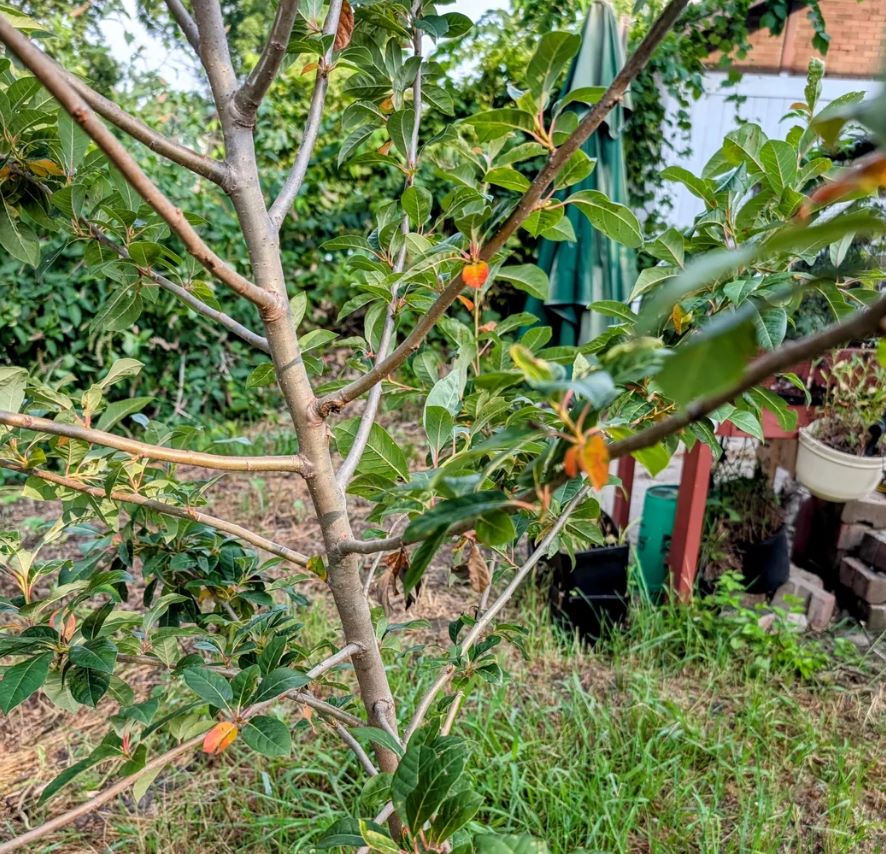 One issue was the prematurely yellowing leaves with what appeared to be bite marks, even though there were no visible insects. Another issue was that the tree leans to the side, prompting the homeowner to consider staking it.