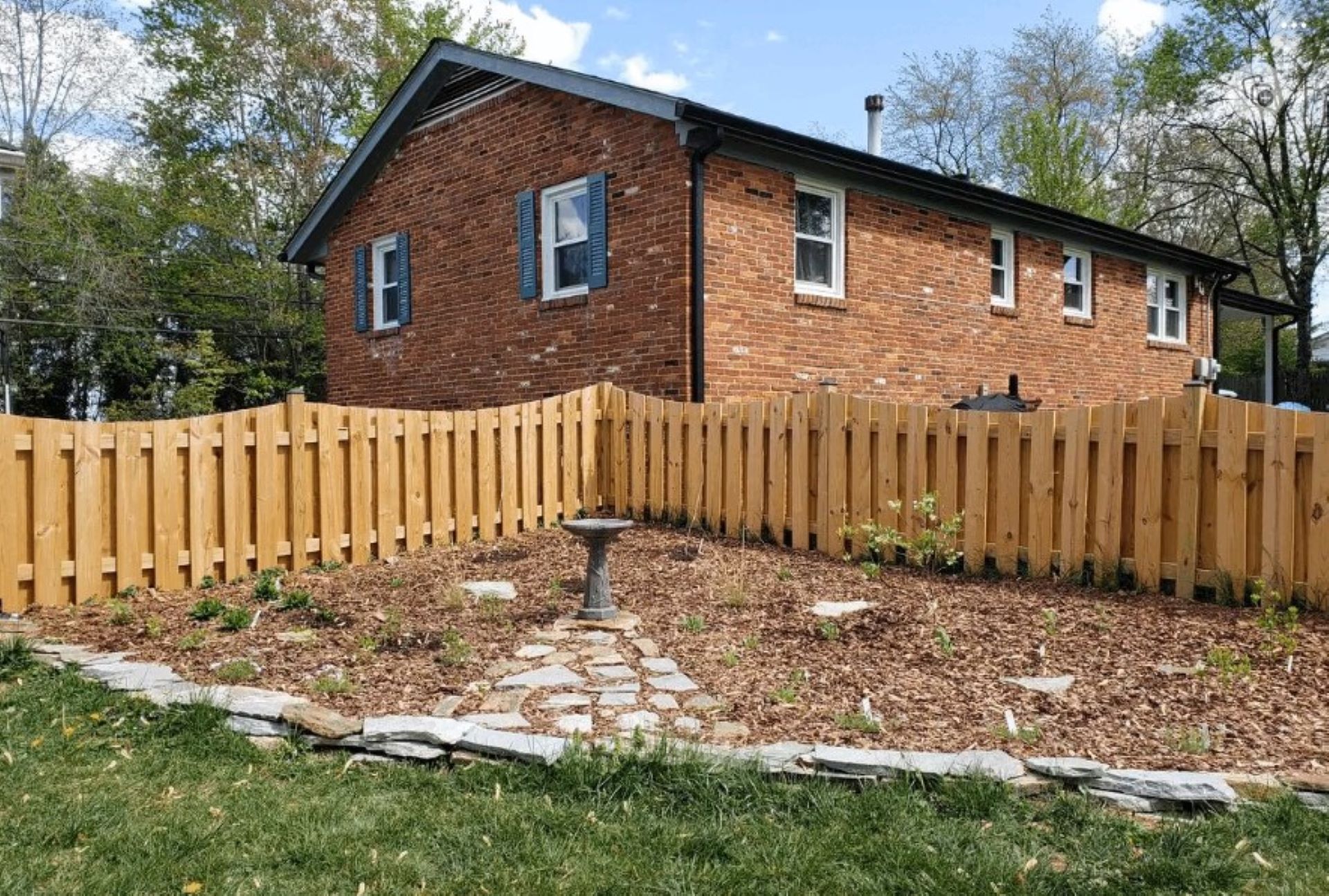 They started off with a charming, stone-bordered bed in the corner of a wooden fence, with a small path leading to a bird bath and a few scattered flagstones.